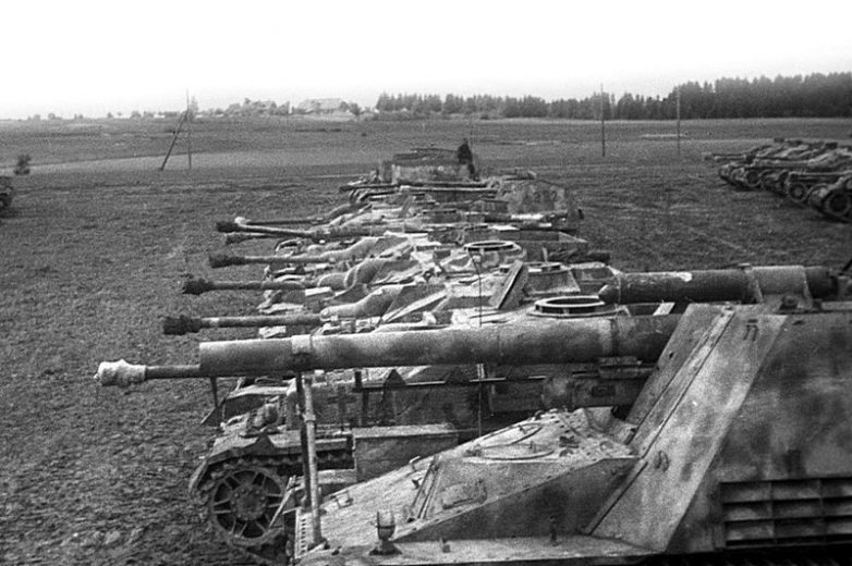 Немецкая САУ «Хуммель» (15 cm Panzer-Haubiter 18/1 auf Fahrgestell des Geschutz Wagen III/IV Hummel, Sd.Kfz. 165, на переднем плане), штурмовые орудия StuG III и StuG IV, захваченные советскими войсками. В одном ряду со штурмовыми орудиями стоят две САУ Marder III (первая — Marder III Ausf.M с бортовым №332).