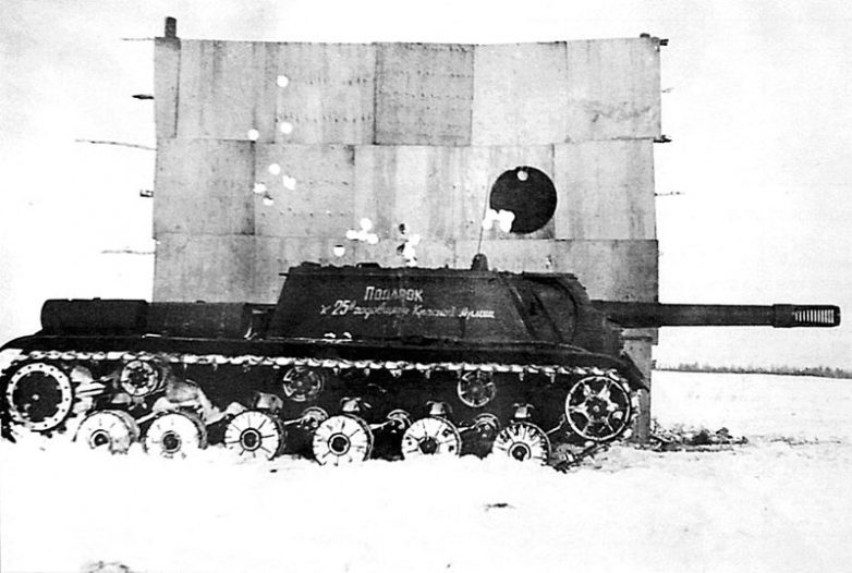 Советская САУ КВ-14 (СУ-14) у стенда с мишенью на испытательном полигоне Челябинского Кировского завода (ЧКЗ). КВ-14 (СУ-14) – прототип САУ СУ-152.