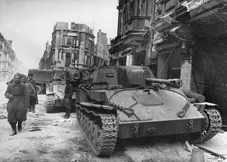 Колонна советских САУ ИСУ-122 на одной из улиц Берлина.