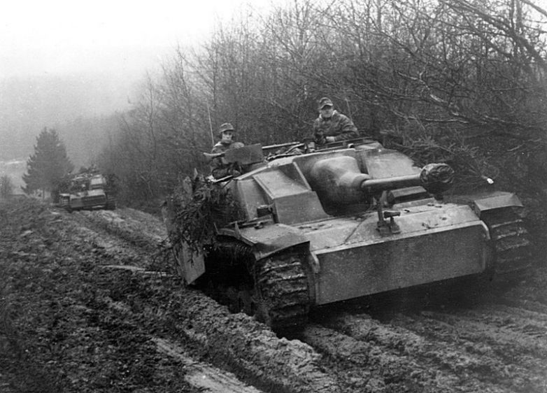 Немецкие САУ StuG III и Stuh 42 на марше в Бельгии. Место съемки: Бельгия Время съемки: 18.12.1944