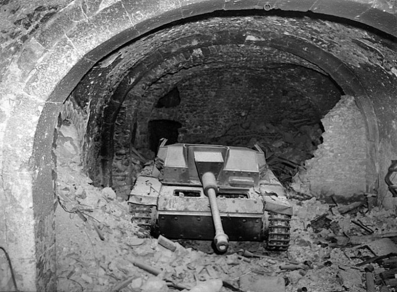 САУ вермахта «Штурмтигр» (38 cm RW61 auf Sturmmörser Tiger), брошенная на улице населенного пункта. САУ вооружалась 380-мм корабельным реактивным минометом, предназначенным для разрушения баррикад, домов и укреплений в условиях уличных боёв.