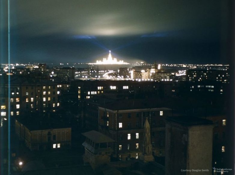 Тогда недавно построенное здание МГУ в ночной подсветке