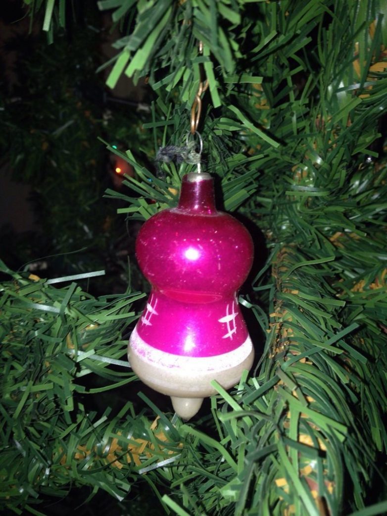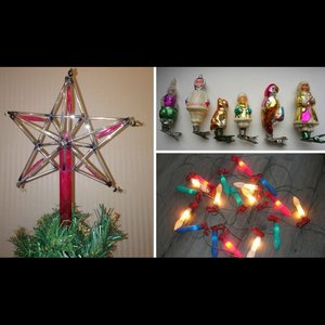 У нас осталась маленькая пластмассовая сборная ёлочка и игрушки к ним. А из детства помню, очень любила, Мухоморчик и Дед Мороз со Снегурочкой на прищепках, Сосульки витые и с теснением в виде конусов с двух сторон.