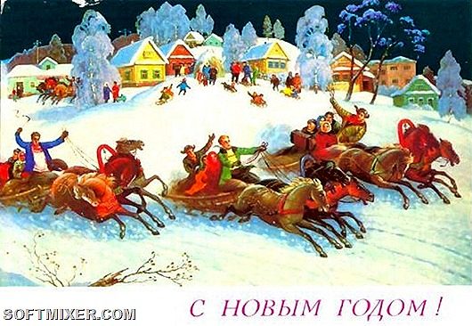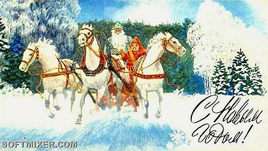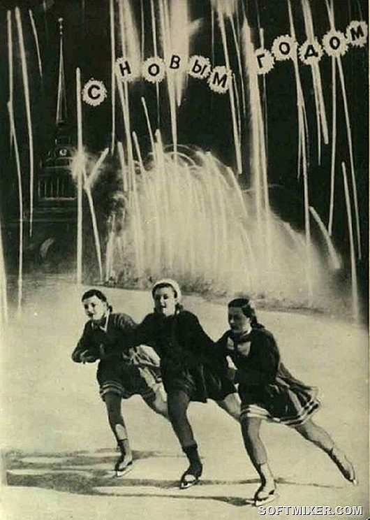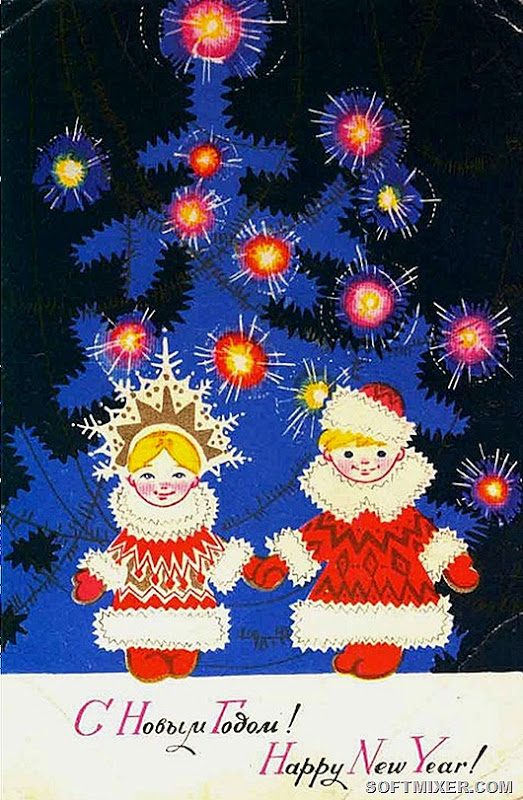 На первых советских новогодних открытках изображались счастливые мамы с ребятишками и башни Кремля, позднее к ним присоединились Дед Мороз и Снегурочка.