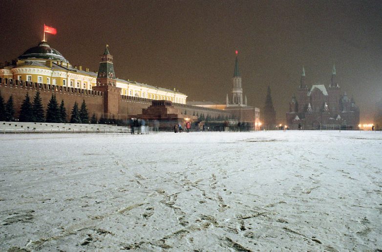 Один из последних вечеров, когда красный флаг развивается над Кремлём и Красной площадью, вечер субботы 21 декабря 1991 года. Флаг был сменён на российский триколор в ночь на Новый год.