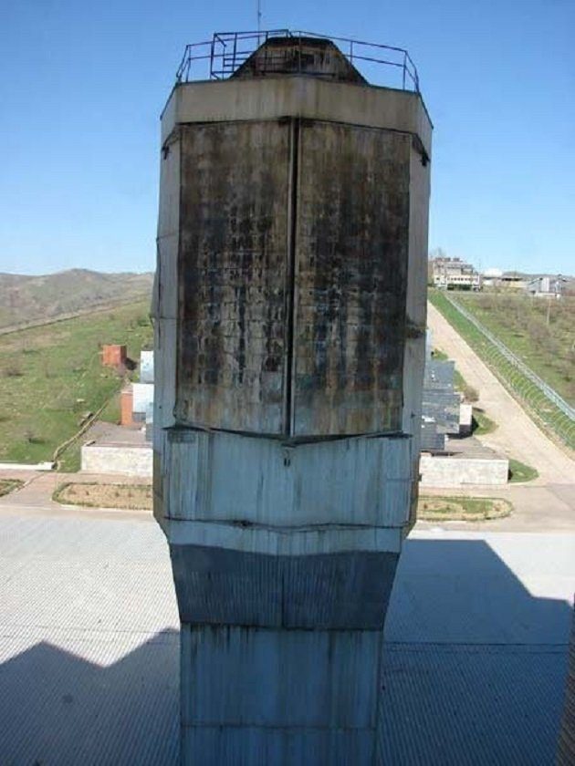 Каркас семиэтажной башни также сформирован из металлоконструкций, облицованных легкими сэндвич-панелями. В ее верхней части расположена так называемая «приемно-рабочая камера», куда и попадает раскаленный лучистый поток, сфокусированный на зеркале концентратора. Рабочая поверхность печи постоянно охлаждается циркулирующей водой изнутри и снаружи.
