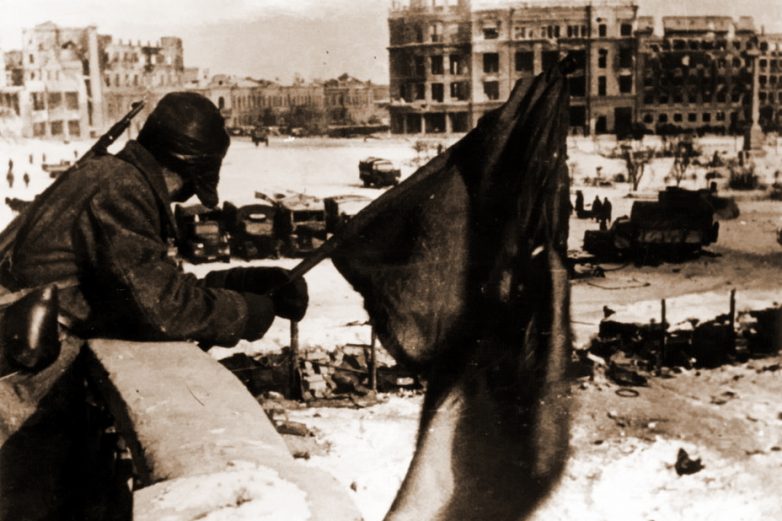 Один из широко известных снимков с водружением красного знамени на здании Сталинградского облисполкома на Площади Павших борцов, сделанных после окончания боев, в начале февраля 1943 года. На заднем плане выходящая на площадь улица Островского, слева гостиница «Большая Сталинградская», справа городской универмаг, последнее прибежище штаба 6-й армии вермахта