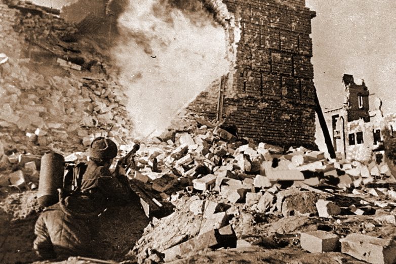 Боец, вооружённый ранцевым огнемётом РОКС-3, ведёт бой в развалинах Сталинграда