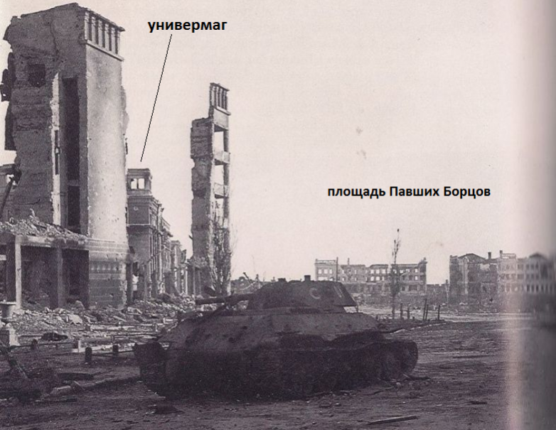 Уничтоженные реактивные установки Б-8–24 на перекрёстке улиц Донская и Пархоменко («заполотновский» район). Фото из книги В. Вюстера «В аду Сталинграда»В подземном командном пункте 62-й Армии душно и не протолкнуться, командование (командарм В. И. Чуйков, начштаба Н. И. Крылов и член военного совета К. А. Гуров) совещалось на улице. С севера были слышны перестрелка и сильные разрывы, грохот боя приближался. Запыхавшиеся посыльные докладывали: на Мамаевом кургане немецкая пехота, к вокзалу вышли автоматчики противника, у «домов специалистов» тяжёлые танки немцев [«штуги» — прим.авт.], обе переправы под сильным обстрелом.