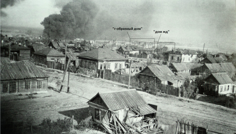 Панорама берега Волги в районе Соляной пристани. Справа горят баки Нефтесиндиката. Четырёх-пятиэтажный «дом железнодорожников» и шестиэтажка «Г-образного дома» с сентября по декабрь станут немецкими опорными пунктами. В подвалах комплекса НКВД, пивзавода и мельницы в это время будут располагаться штабы подразделений 13-й Гвардейской стрелковой дивизии. Кадры из советской кинохроники