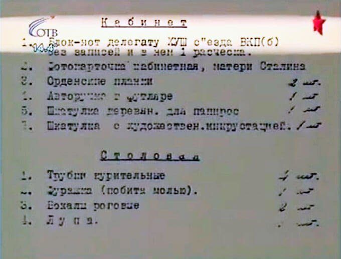 5 марта 1953 года в 22 часа 30 минут, я, комендант Ближней дачи Орлов, старший прикреплённый Старостин, помощник Туков, сотрудник Бутусова составили опись л / имущества товарища Сталина И. В. по указанию товарища Берия.