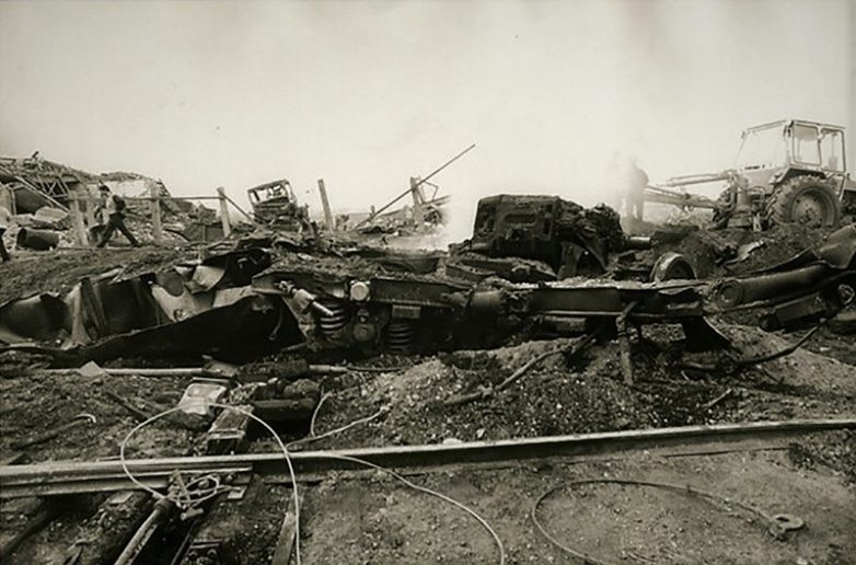 Где-то в тех-же годах в г.Куровское МО взорвались 2 вагона, зимой. Около были частные дома, после взрыва без крыш.Люди сидели рядом с домами на улице у костров. Также в гармошку превратилась рядом стоящая электричка, хорошо пустая.