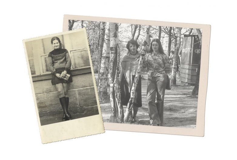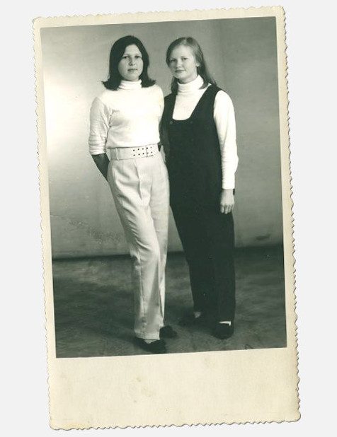 Носили преимущественно платья и юбки — сочетали их с блузками или свитерами. У сестры был прекрасный австрийский свитер с орнаментом, который она носила с прямой юбкой. В это время были модны и юбки-полусолнце, которые мы шили из клетчатой шерстяной ткани. Надо сказать, что в начале 70-х брюки женщины еще повседневно не носили.