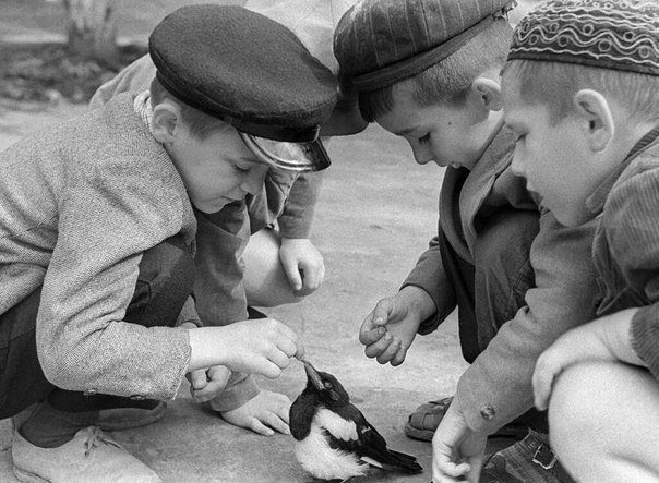 Дети играют с сорочонком. CCCР, 1965 год