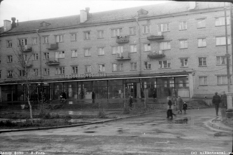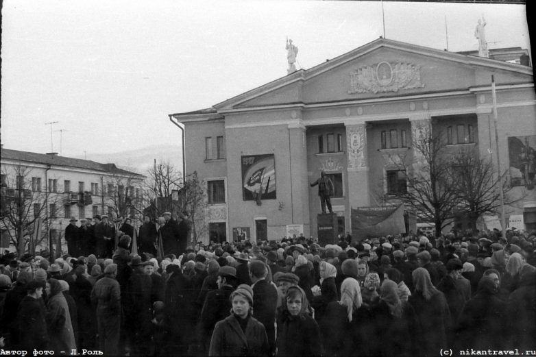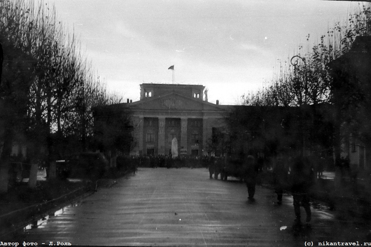 Площадка, ныне вымощенная плитами, тогда еще засыпана щебенкой. Обратите внимание на оформление ДК: