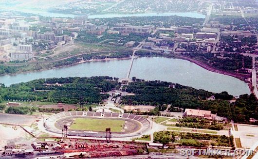 Стадион «Локомотив» (сейчас «Олимпийский»). Чаша стадиона еще не закончена: сооружение круга зрительских мест проходило не один год. Позади стадиона проложена трамвайная линия: