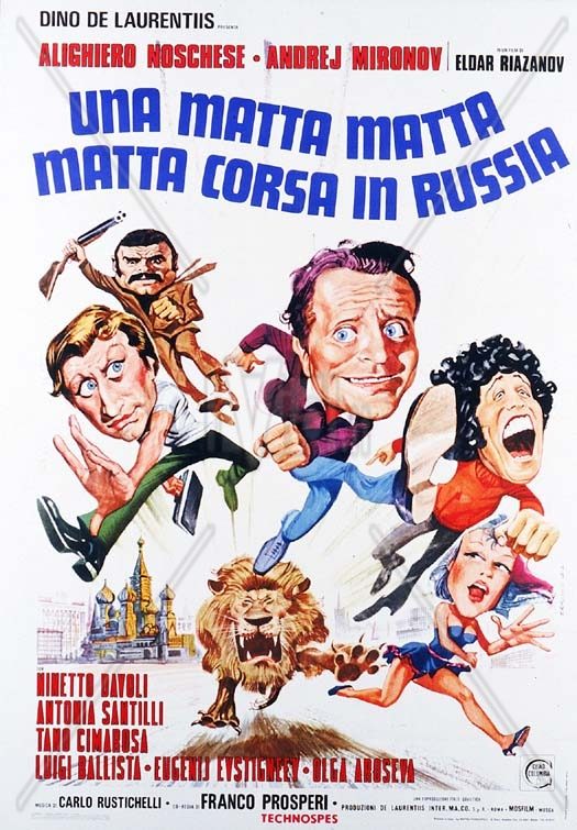 В итальянском варианте комедия называлась «Одна безумная, безумная, безумная гонка по России» («Una matta, matta, matta corsa in Russia»), что являлось отсылкой к пародируемому фильму «Этот безумный, безумный, безумный, безумный мир». В разных трюковых эпизодах советская картина пародирует и другие приключенческие ленты тех лет: «Крысиные бега», «Сицилийский клан» (оттуда Эльдар Рязанов позаимствовал сцену приземления самолета на оживленную трассу) и «Забриски-пойнт» (из гангстерской ленты Микеланджело Антониони был скопирован взрыв бензоколонки).Безумная гонка была как в кадре, так и за кадром – таких темпов съемки в Советском Союзе еще не знали. Члены съемочной группы разбили западное представление о медлительности советского кинопроизводства – на деле Рязанов доказал обратное. Обычно на подготовку одного трюка давалось несколько месяцев, а тут все трюки были поставлены за 31 день! А за два месяца, начиная с 14 мая 1973 года, было готово 90 процентов фильма. Рязанов сам себе удивлялся: ему впервые пришлось снимать с такой скоростью. На отдых съемочной группе отводился один выходной, в остальные шесть дней недели съемки велись почти круглосуточно, в две смены. Даже экспрессивные итальянцы взвыли от столь плотного графика, а наши актеры не роптали. Отказывались итальянские актеры и от сложных трюков (без дублера прыгал с моста в реку лишь Джузеппе – Нинетто Даволи), а советские коллеги выполняли всё, что было в их силах.