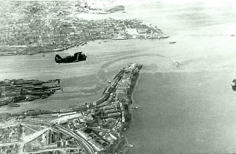 Советские истребители И-153 «Чайка» из 32-го истребительного авиаполка ВВС Черноморского флота в полете над Севастопольской бухтой. Время съемки: 1941.