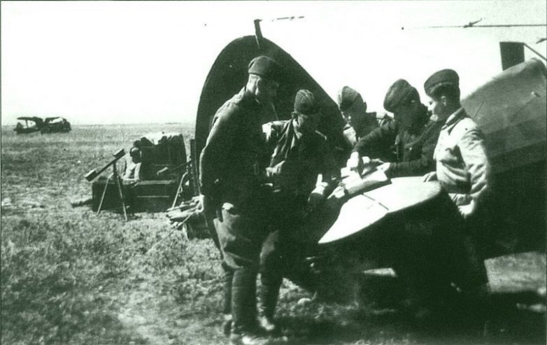 Советские летчики 875-го ОСАП на аэродроме у истребителя И-153 «Чайка».