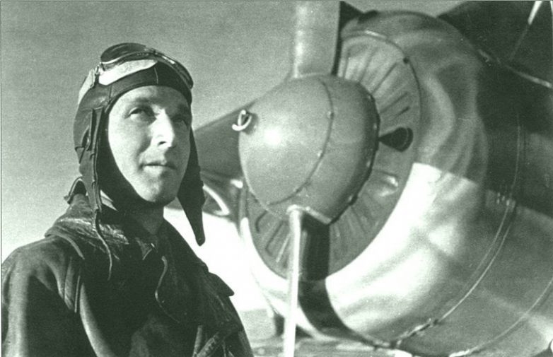 Летчик-истребитель советского 186-го ИАП, командир звена лейтенант Григорий Иванович Егунов стоит на фоне своего истребителя И-153 «Чайка».