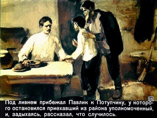 Объявил Павлуша тогда войну отцу и кулакам: только уполномоченные в деревню, а Павлик со своим пионерским отрядом тут как тут. И точно — все расскажет и покажет, где какой мироед зернышко припрятал…