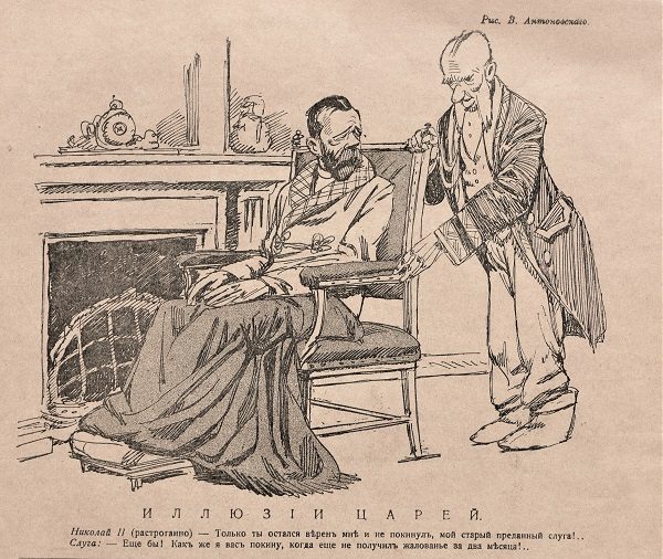 Николай II (растроганно): «Только ты остался верен мне и не покинул, мой старый преданный слуга!..»Слуга: «Еще бы! Как же я вас покину, когда еще не получил жалованье за два месяца!..»