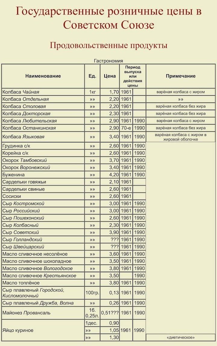 Мне 71 год. Не торгаш, и не член КПСС. Всю жизнь прожил не в Москве, но в холодильнике мясо, масло сыр, колбаса и сметана, не говоря уже о других продуктах были постоянно. И заметьте отличного качества. Цены на одежду и обувь из соцлагеря не повышались. Да и в этом перечне цен очень много неточностей в большую сторону.