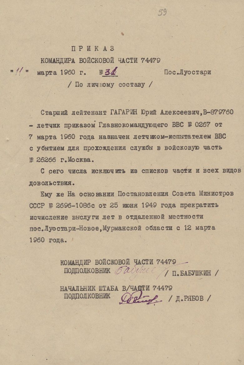 Об исключении старшего лейтенанта Ю.А. Гагарина из списков части в связи с назначением летчиком-испытателем ВВС и дальнейшим прохождением службы в Москве.