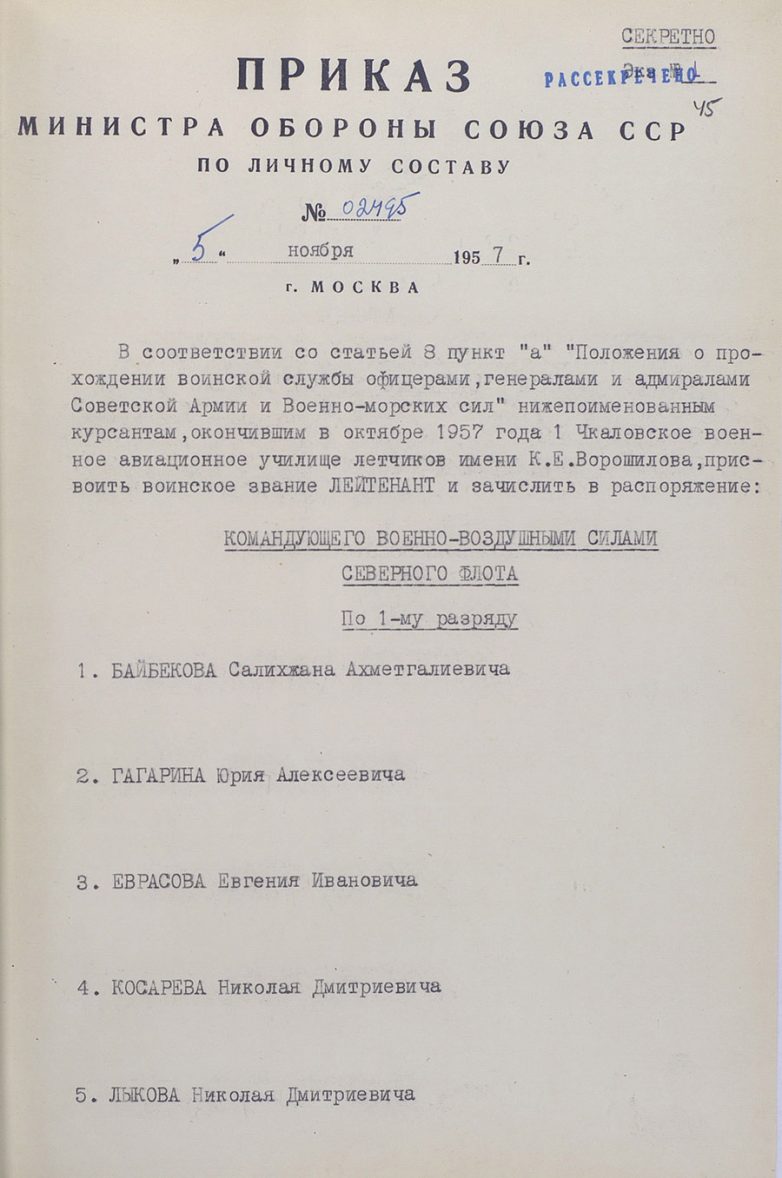 Рассекреченные архивные документы из фондов ЦА МО, рассказывающие об офицерской службе первого космонавта планеты Земля.