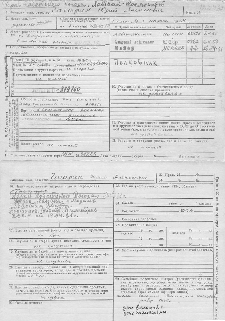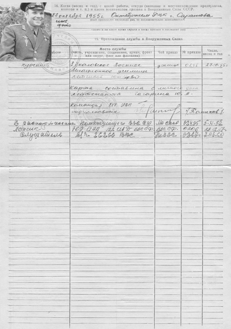 В карточке в хронологическом порядке указаны должности, на которых служил Ю.А. Гагарин и места службы, а также социально-демографические данные.