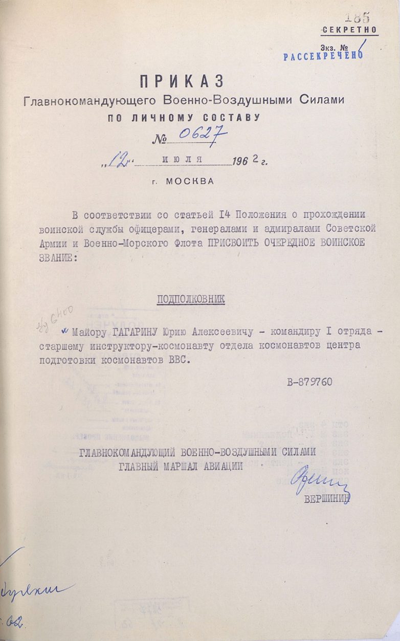 О присвоении очередного воинского звания «подполковник» Ю.А.Гагарину – командиру 1-го отряда – старшему инструктору-космонавту отдела космонавтов Центра подготовки космонавтов ВВС.
