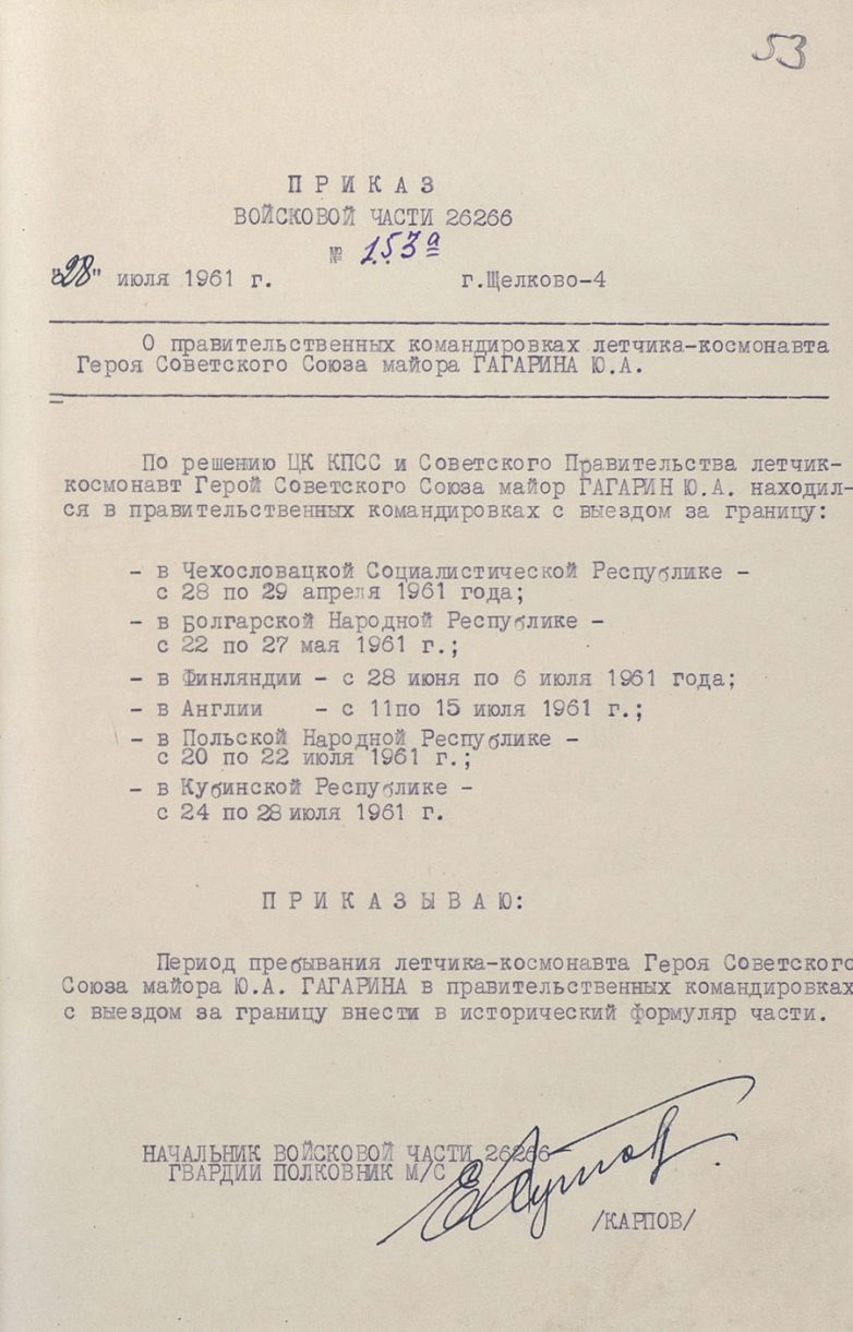 Приказы о нахождении в правительственных командировках летчика-космонавта Героя Советского Союза майора Ю.А.Гагарина с указанием стран посещения