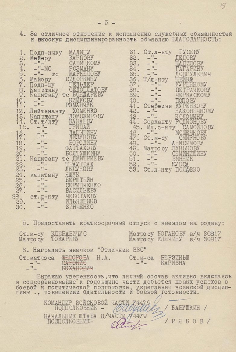 Об объявлении передовых офицеров, отличников боевой и политической подготовки, отличных экипажей, групп и звеньев. В данном приказе трижды отмечен старший лейтенант Ю.А. Гагарин.