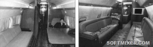 А это президентский люкс по-советски. В нем летали только высшие партийные руководители. Кожаные кресла, красный ковер и полированная мебель.