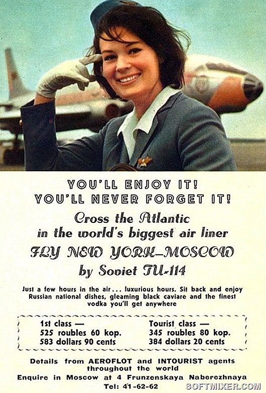 Рекламные плакаты «Аэрофлота» предлагали трансатлантический перелет в первом классе за 583 долларов 90 центов, что составляло по официальному курсу 525 рублей 60 копеек, обещая высокий уровень комфорта, настоящую русскую водку и черную икру.