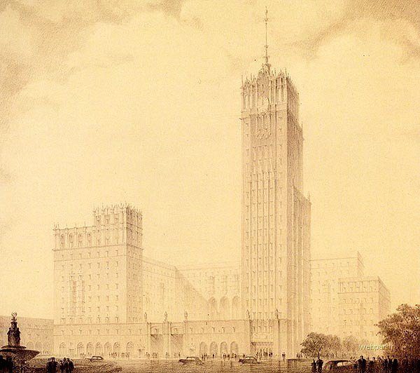 Дворец господствует над всем. Статуя Ленина как бы парит над городом. Её видно издалека. За Дворцом Советов просторно раскинулись здания Академии Наук. Это целый город. Библиотека, лаборатории, здания съездов, музей — вытянулись до самого берега Москвы-реки. Низменных, заброшенных Лужников не узнать. Они застроены великолепными общественными зданиями, среди которых выделяется выставка индустрии социализма. Миллионы кубометров грунта с трассы метро были использованы на подсыпку Лужников.