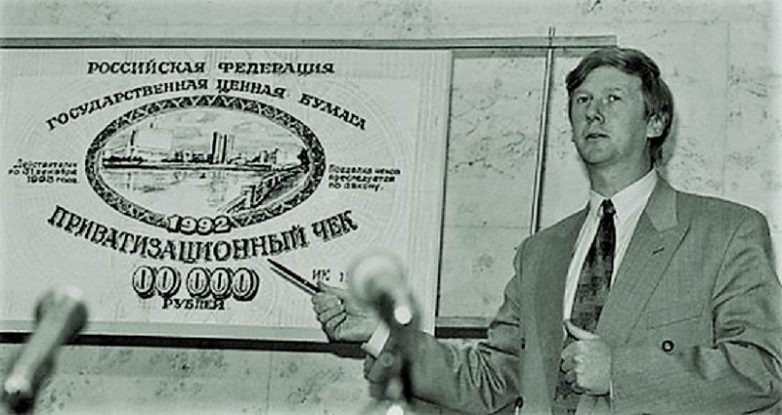 Были выпущены ваучеры, в которые обернули огромные материальные богатства страны. Народу было объявлено, что все делится по справедливости и поровну. Ваучеры раздали нищим проторговавшимся гражданам. Меньшая часть осчастливленных удивленно пялила глаза на кусочек Родины, лежавший под стеклом на письменном столе, а большая ринулась их продавать в фонды, заботливо созданные для скупки ваучеров теми же, кто выпустил ваучеры. Страна из общей быстро становилась личной.
