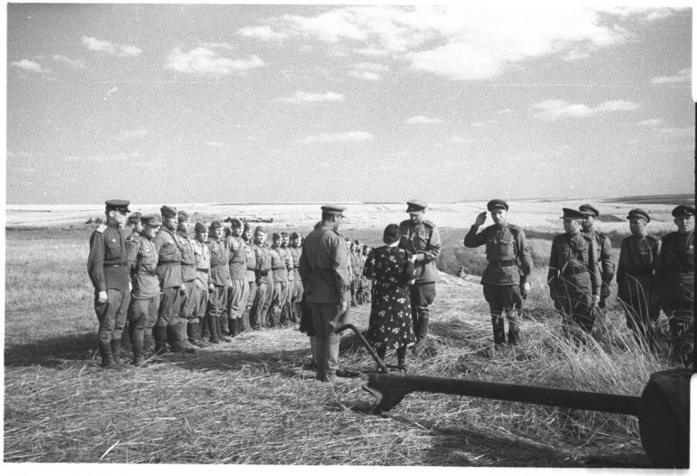 Курская область, 1943 год. Гвардии полковник В. Рукосуев вместе с офицерами бригады встречает семью гвардии младшего сержанта Хитрых и вручает его жене Анне Николаевне орден героя.