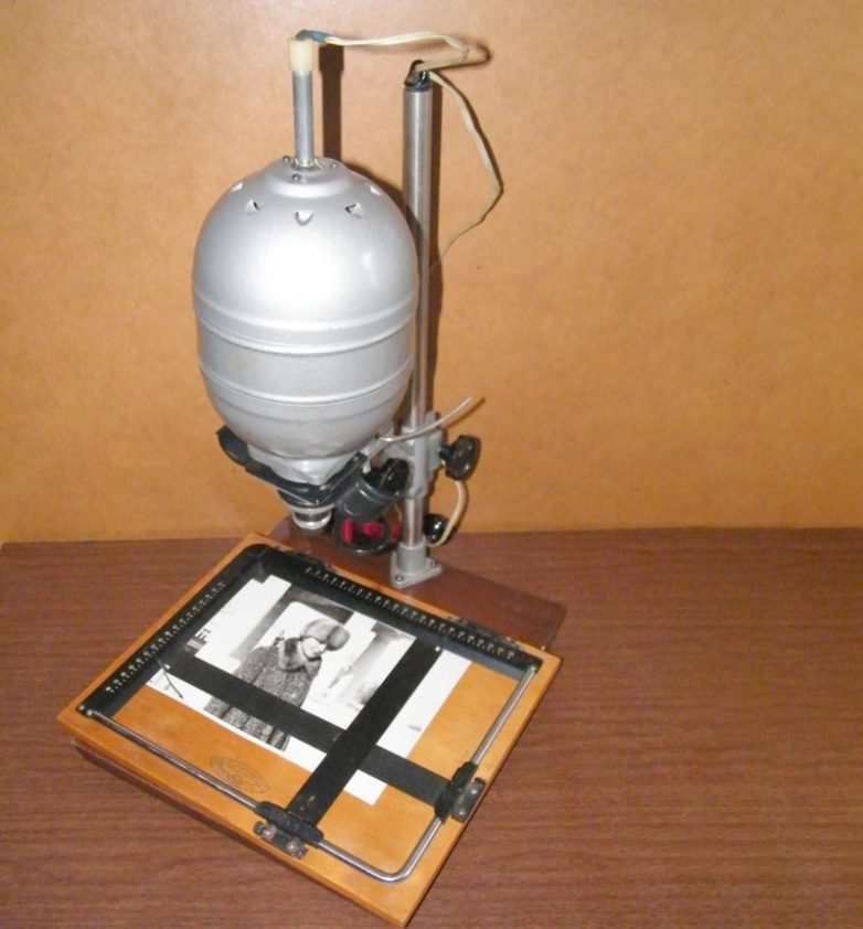 Начинается самое интересное. Процесс печати, в общем, довольно прост. При красном свете фотофонаря, лист незасвеченной фотобумаги укладывают в кадрирующую рамку эмульсией вверх. Корпус увеличителя с лампой и объективом поднимался на кронштейне на такую высоту, которая требовалось для того или иного масштабирования — чем выше, тем крупнее снимок.