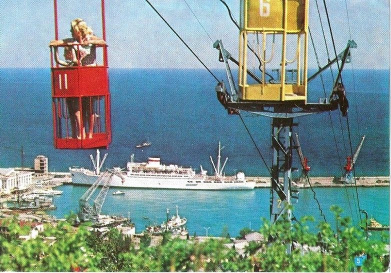 Называется — Ялта-горка. Построена в 1967 году. 600 метров пути. Сейчас кабинки уже других, ярких цветов и закрытого типа.
