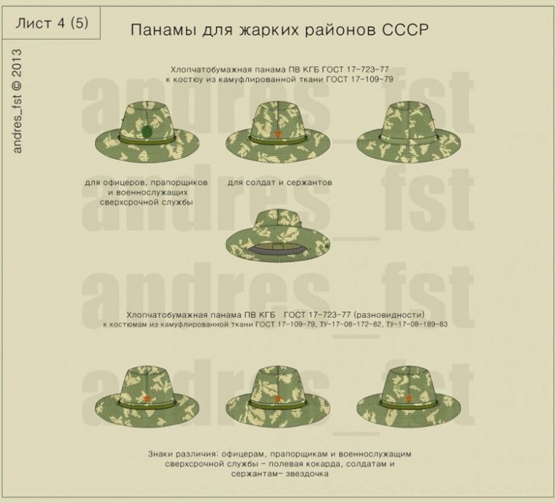 Для районов с жарким климатом в комплекте новой одежды предусматривалась панама камуфлированной расцветки. «Дубовые» панамы носили не только пограничники, их выдавали военнослужащим групп «Альфа» и «Вымпел», а также сотрудникам различных оперативных служб КГБ СССР. Некоторая часть камуфлированных панам проходила пробную носку и в частях Министерства обороны.