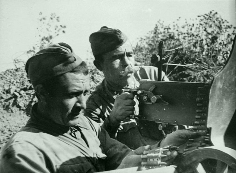 На втором плане виден подбитый танк Т-34 из состава 6-го механизированного корпуса. В данном бою в засаду попало управление штаба 6-го механизированного корпуса.39. Сержант Гавриил Иванович Залозный (1901 года рождения, справа) у пулемета «Максим». Время съемки: 1941.