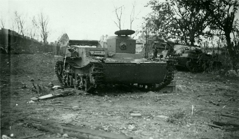 Танк Т-34 танк с пушкой Л-11 выпуска октября 1940 года. Заводской № 682-35. Танк принадлежал 12-й танковой дивизии 8-го механизированного корпуса 26-й армии Юго-Западного фронта. Подбит в районе Дубно, возможно юго-восточный въезд в Дубно. Согласно набписи на правом борту, танк подбит солдатами 111-й пехотной дивизии и полка «Герман Геринг». Предположительно, танк был подбит 29 июня 1941 года.31. Советский танк Т-34, подбитый у дороги в районе Дубно.