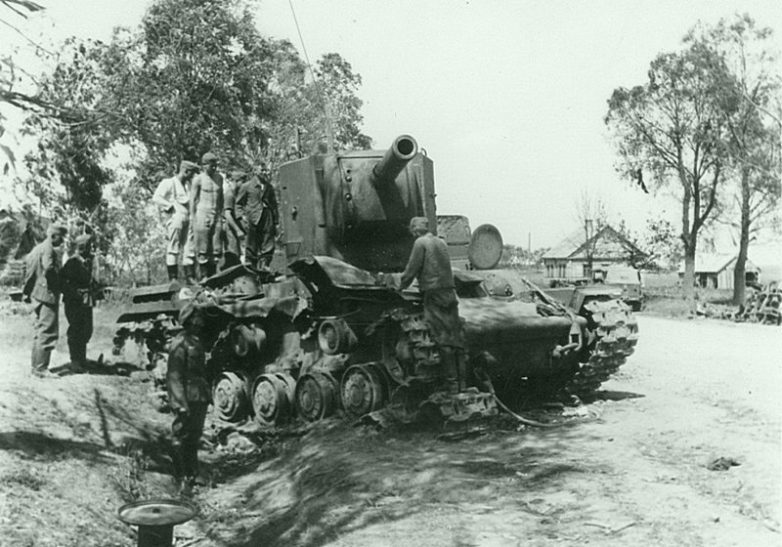 Тяжелый танк КВ-2 и средний танк Т-34 образца 1940 года с пушкой Л-11 из, предположительно, 16-го танкового полка 8-й танковой дивизии 4-го механизированного корпуса РККА, застрявшие, а затем подбитые 23 июня 1941 года во время преодоления ручья Майданский. Танки вели бой в районе села Старый Майдан Радеховского района Львовской области Украины.28. Немецкие солдаты рассматривают советский танк КВ-2, застрявший в ручье Майданский. Место съемки: Львовская область, Украина. Время съемки: 23-29.06.1941