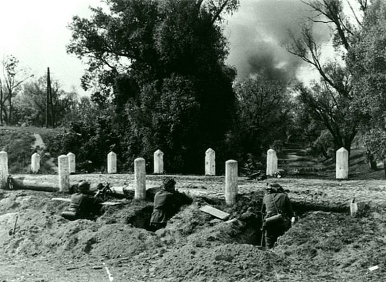 После провала внезапного захвата Брестской крепости немцам пришлось окапываться. Фото сделано на Северном, либо Южном острове.13. Бой немецких ударных частей в районе Бреста. Время съемки: июнь 1941