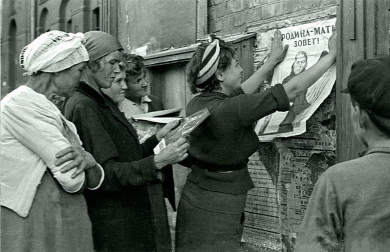 Женщина наклеивает на доску объявлений плакат «Родина-мать зовёт!». Знаменитый плакат времён Великой Отечественной войны был создан художником Ираклием Тоидзе в конце июня 1941 года.