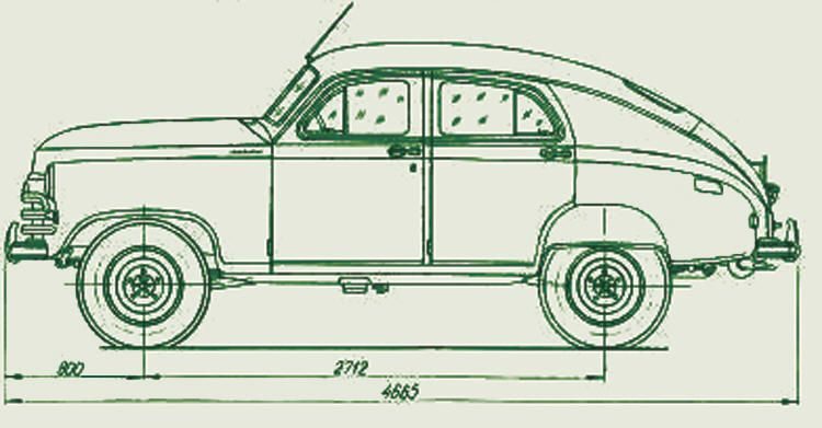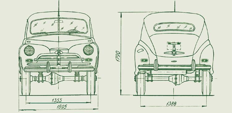 Группа конструкторов во главе с Григорием Вассерманом просто усилила слабые части победовского кузова и увеличила дорожный просвет. Для этого было решено задние рессоры устанавливать не под балкой заднего моста, как на М-20, а над ней. При этом кузов поднялся на 150 мм. Кроме того, вместо передней независимой подвески на витых пружинах поставили передние рессоры.