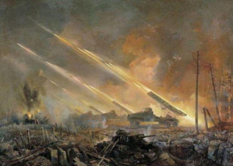На позициях засвистело, загудело, пламя на пол-гектара. И полетели снаряды. Через десяток секунд на немецкой стороне сплошная туча взрывов и пламени, немцы бегут. Генерал в восторге. А адъютант толкает под локоть: «Назад посмотрите, товарищ генерал!»