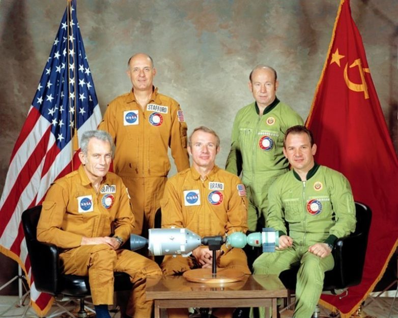 Участники совместного советско-американского космического проекта СОЮЗ-АПОЛЛОН — Алексей Леонов, Валерий Кубасов, Томас Стаффорд, Дейк Слейтон, Ванс Бранд.