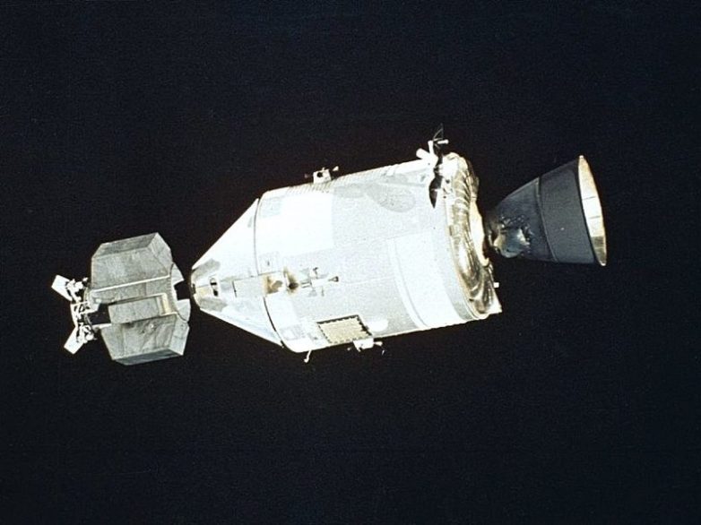 19 июля корабли отделились. Совместный полет длился 43 часа, 54 мин. и 11 сек. На фото космический корабль «Аполлон»
